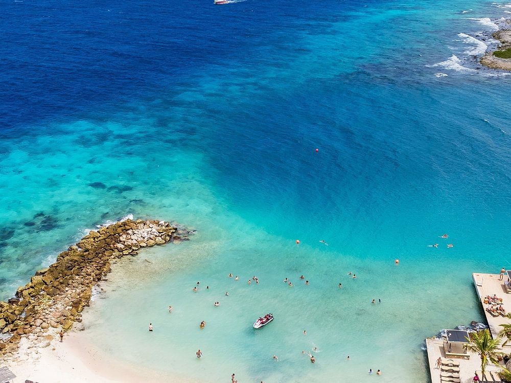 This atmospheric drone shot of Curaçao's Jan Thiel Bay perfectly captures the unique balance between lively tourist activity and natural beauty. From the air, a panoramic view unfolds over the clear blue water that looks almost unreal in its intensity. Along the coastline is the popular Jan Thiel beach, where you can subtly see the presence of people and beach beds - lively, but not overpowering. The large amount of water in view gives the shot a calm, open feel, emphasising the expanse of the bay and the natural contours of the coastal area. The tropical vegetation along the edges and the play of light on the water give the photo a warm, inviting atmosphere.
