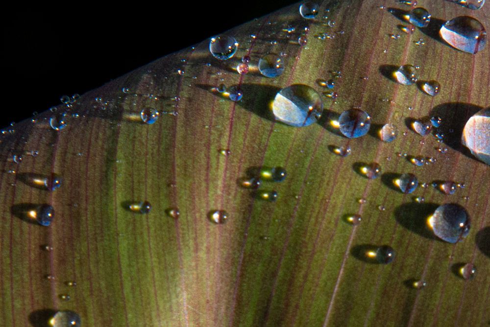 Drops on a green and pink leaf. Dew / rain drops have a blue hue.
