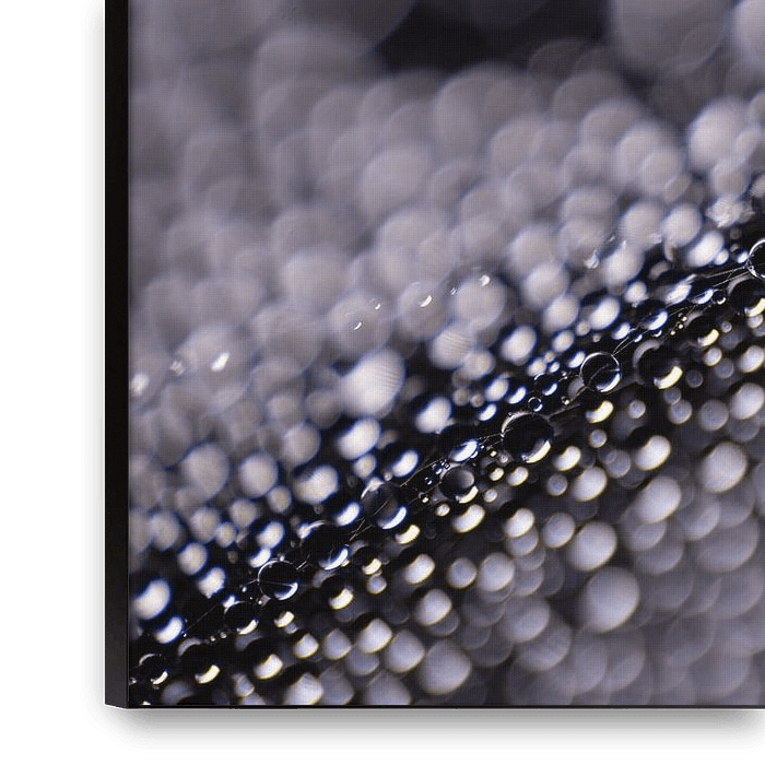 Close up of drops in a spider's web. The sharp drops form a diagonal surrounded by blurred drops. The background is dark. the image is almost monochrome