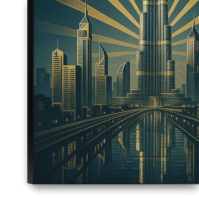 Buy this landscape artwork Dubai Burj Khalifa Poster – Vintage Skyscraper & Art Deco Skyline by Travel Shop on canvas, ArtFrame, poster and wallpaper, printed on demand in high quality.