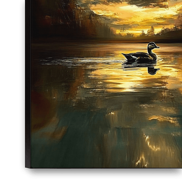 This beautiful image shows a serene duck peacefully bobbing on the water while the sky is filled with an impressive mix of golden and dark clouds during a breathtaking sunset. The reflection of the sky in the water adds an extra dimension to the scene, making this artwork perfect for those who love natural beauty and want to bring a…