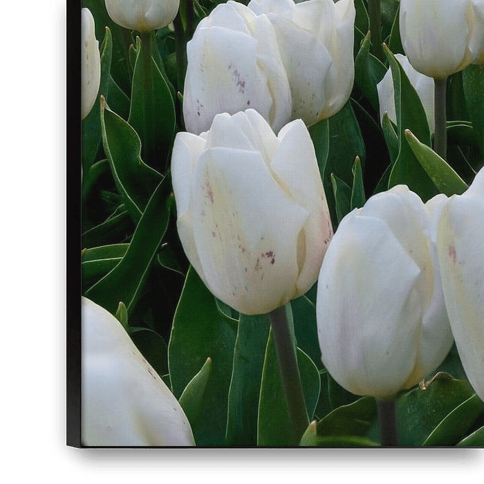 A field of white tulips stretches into the distance. The dim sun peeks through thick clouds, creating a gentle glow over the scene.