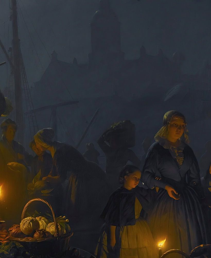 Dutch market by moonlight, Petrus van Schendel (1853)