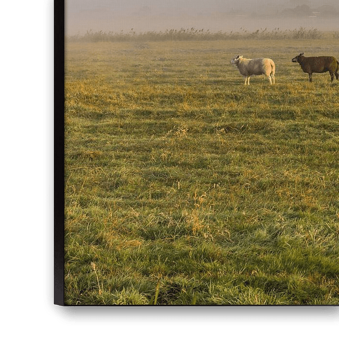 Buy this still life Dutch misty landscape with grazing sheep with the town of IJlst in Friesland in the background. Wo by Wout Kok on canvas, ArtFrame, poster and wallpaper, printed on demand in high quality