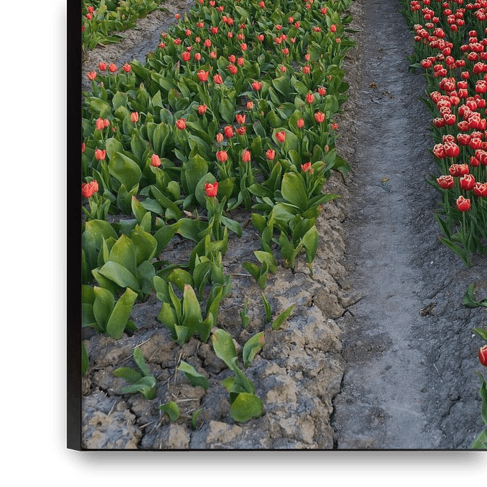 Tulip lines in a tulip field near the Keukenhof, Lisse. With a single red tulip in front. The path and the tulip strips create a deep perspective that draws your attention to the picture.