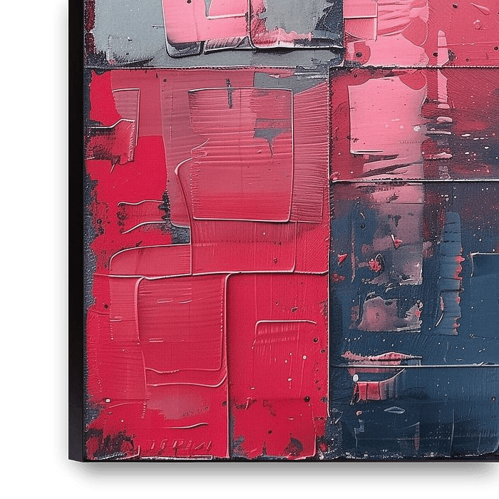 Abstract composition composed of rectangular and square areas in a rich and vibrant colour palette. The colours range from deep reds and roses to accents of yellow and blue, which give the composition a dynamic and layered character. The surfaces appear rough and textured, adding a sense of depth and tactility to the work.