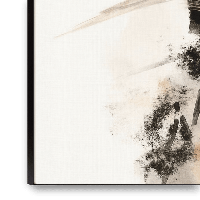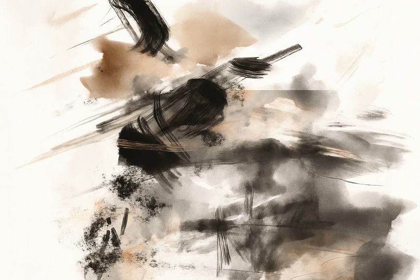 Fluid brushstrokes and soft ink clouds form a dynamic whole with a soothing undertone. Dark accents cut through light mists, while grainy spots and subtle splashes add depth. The composition balances between movement and stillness, with diagonal lines providing direction and open spaces creating breathing room. A warm, cool mix of…