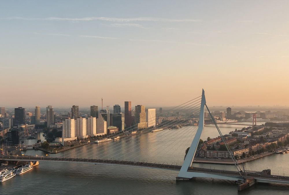 Sunrise in Rotterdam from the Southbank with the Erasmus bridge and the Zalmhaventower in the background.