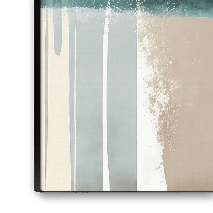 This creation consists of planes in earthy colours, including teal. The planes are harmoniously arranged and create a sense of balance and connection. The artwork exudes a calm and serene feel, with a subtle reference to the natural elements. A visually appealing piece that combines the warmth of earthy tones with a touch of refreshing teal, this stunning creation has been digitally processed using artificial intelligence, resulting in the highest possible image quality. Even up close, the lines and figures remain razor-sharp and detailed, making the artwork a stunning visual experience.