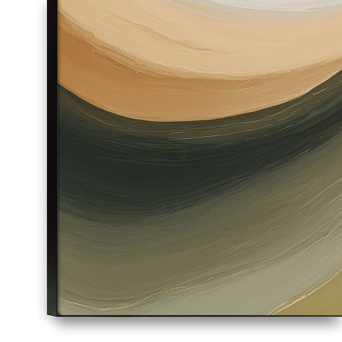 An organic layered landscape in warm earth tones. The flowing shapes are reminiscent of geological structures and natural currents. The colours - beige, green and gold - create a harmonious look that brings tranquillity to any room.