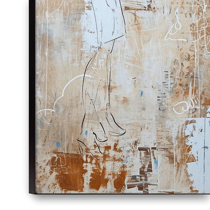 Earthy Contours - This expressive portrait illustrates two figures, their slightly outlined shapes contrasting against a richly layered background reminiscent of weathered walls. The use of earthy colours - brown, beige and terracotta - along with accents of white and abstract line drawings, give the piece a casual, organic…