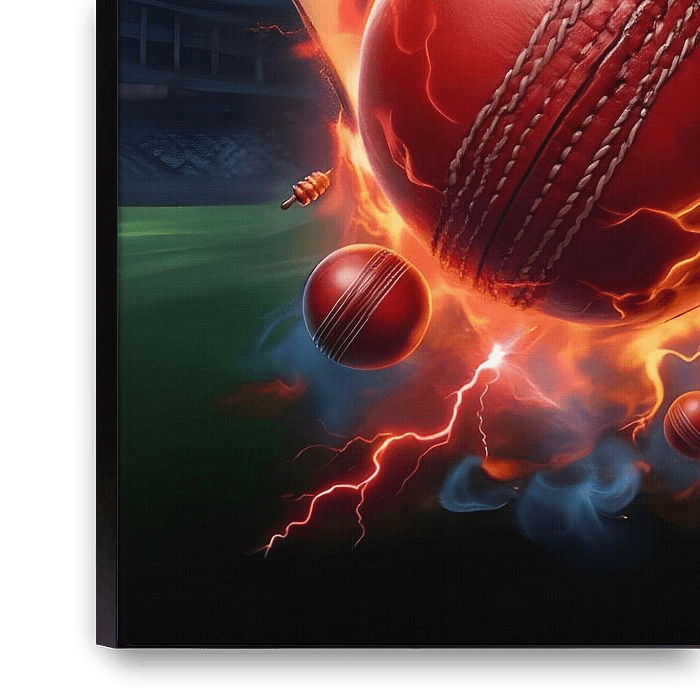 Fuel your cricket fervor with this dramatic retro bootleg poster depicting a fiery red ball exploding with lightning on a stadium backdrop, essential for dedicated fans to infuse homes with thrilling match energy and motivation.