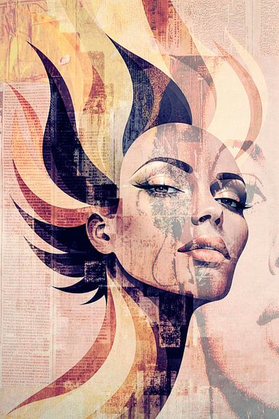 This striking digital artwork combines the finesse of classical portraiture with the raw energy of modern collage techniques. The composition depicts a confident woman whose gaze immediately captures the viewer’s attention, framed by dynamic, flame-like shapes reminiscent of a modern crown or an aura of creativity.