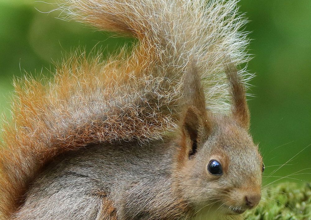 Dit schitterende Europese Eekhoorn jong met een zeer mooie grijs rode vacht en een prachtige volle staart kwam op een mooie zomerse dag de hut in Clinge bezoeken.