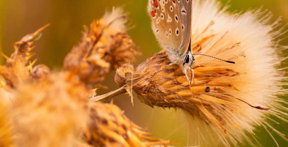 Mooie foto gemaakt van het Icarusblauwtje in het avondlicht. Het geeft een extra sfeer deze kleuren , warmte !