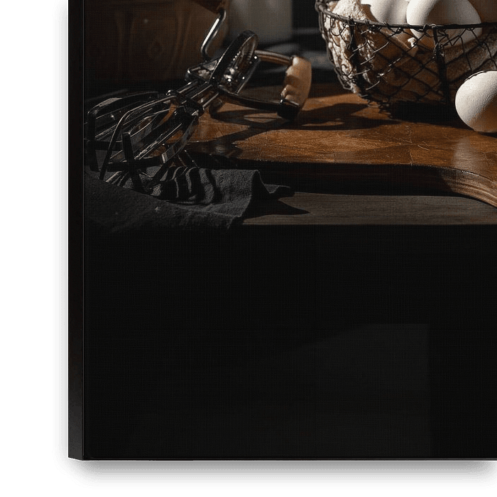 Besides the eggs, which play the main role, the photo shows the ingredients and tools needed to make pancakes. The whisk, the mixing bowl, the milk. And therefore a perfect work for the kitchen.
