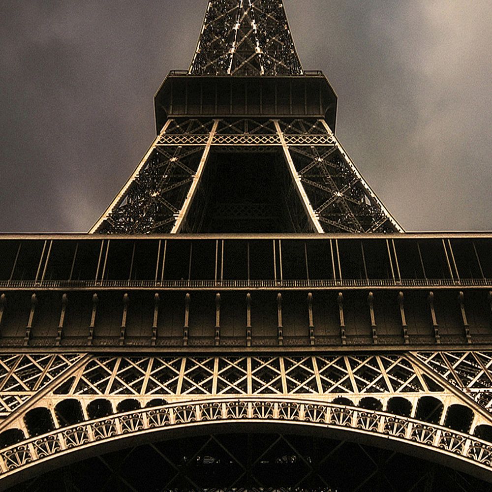 The famous Eiffel Tower from a low vantage point with a super wide angle lens. Lit by the low sun. Colors multiplied and put in Mauve and Gold to make the building look even more monumental.