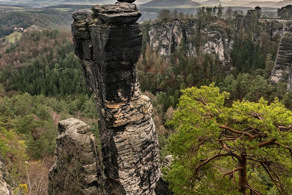 Elbe Sandstone Mountains - View in the Bastei area in southeast direction, prominent rock formation and tree in the foreground, backlight, contrasting sky with clouds - location: Germany, Saxony, Saxon Switzerland, Bastei