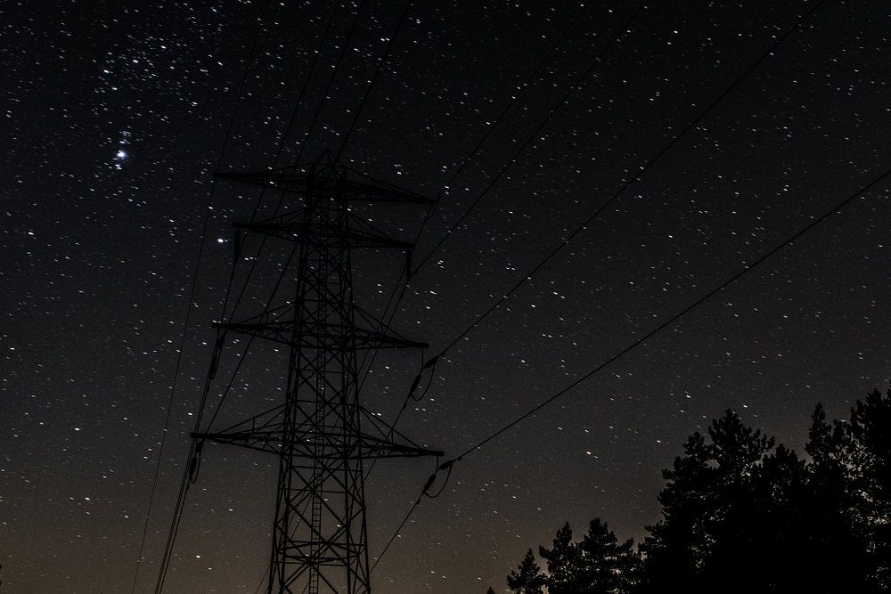 Electricity masts crossing the Veluwe at night.