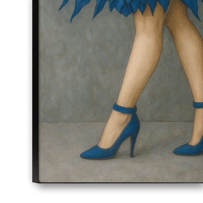 A unique work of art merging fashion and tradition: a dress constructed from deep blue tulips, some of whose petals display porcelain Delft blue patterns. The elegant legs and heels emphasise the couture look, while the fine painting style gives this work a classic, almost museum-like quality.