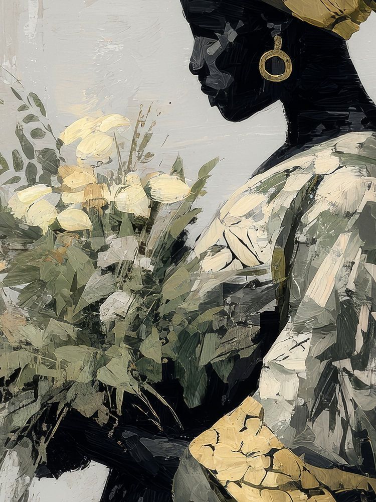 With a graceful pose and a bouquet in her hands, this African woman radiates timeless beauty. Her traditional dress and headgear, rich in patterns and natural tones, tell a story of pride, culture and connection to the earth. The brush-like texture enhances the depth and serenity of this digital portrait.