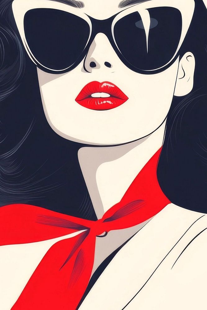 The image presents an elegant woman with voluminous, wavy hair wearing a striking pair of oversized sunglasses. Her bright lipstick in vivid red immediately draws attention, while a red scarf adds a stylish touch to her look. The minimalist colour palette perfectly underlines her glamorous appeal.