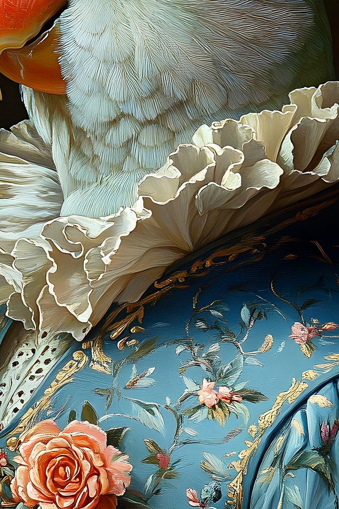 This unique image of a parrot in a beautifully embellished costume with a ruffle and a flower highlights the confluence of nature and art in a playful yet sophisticated style.