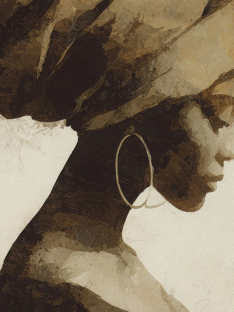 This atmospheric portrait shows an African woman in profile, wrapped in a traditional headscarf and large earring, painted in warm, natural tones. The subdued composition exudes strength, beauty and culture in one image.