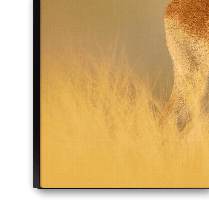 A Red Lechwe also known as Southern Lechwe (Kobus leche) stands majestically in a field of golden grass, perfectly in harmony with the warm tones in its surroundings. The animal is attentive and looks straight into the camera. The antelope's graceful posture and curious gaze make for an enchanting image. I took this photo in the dry season in a swamp in Bwabwata National Park, Namibia. This soothing work has a sunny and bright look