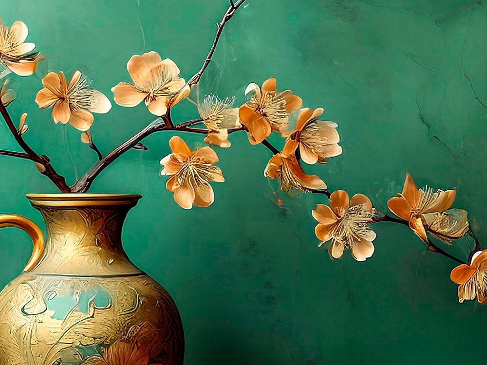 A sprig of almond blossom, an antique vase and a tranquil background - sometimes less is more. This minimalist artwork is an ode to the beauty of nature. The soft colours and clean lines create a sense of balance and harmony.