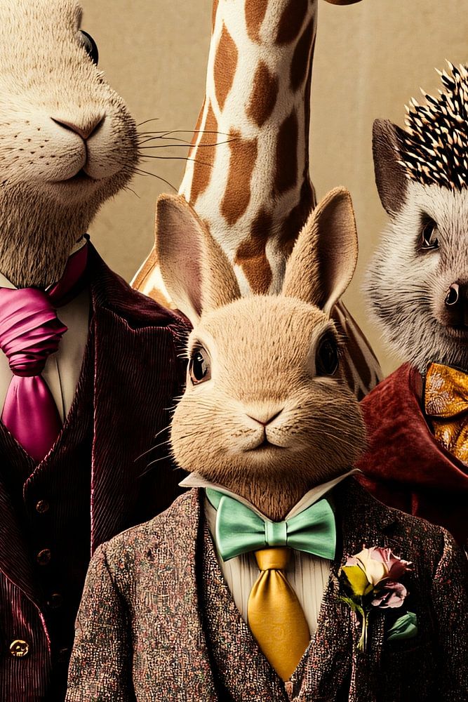 This design combines the charm of animals with the elegance of sophisticated clothing in a surreal setting. Four animals, including a hare, a giraffe, a hedgehog and a rabbit, stand stylishly dressed in an ensemble of rich colours and textures. The unique combination of animals and fashion brings a playful yet sophisticated atmosphere. Perfect for those who love art that exudes both humour and elegance. A real eye-catcher for the home, ideal for a living room or dining room.