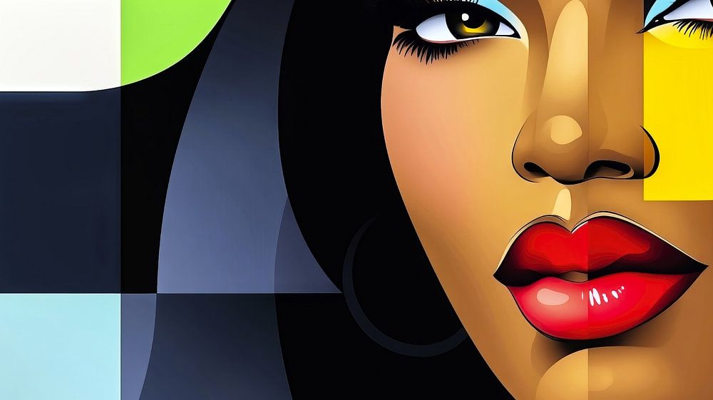 A stunning black woman with bright red lipstick poses confidently against a colourful, graphic background. The combination of bold colours and her modern, elegant style exudes confidence and sophistication. This dynamic image is ideal for themes such as fashion, style consciousness, empowerment and contemporary art.