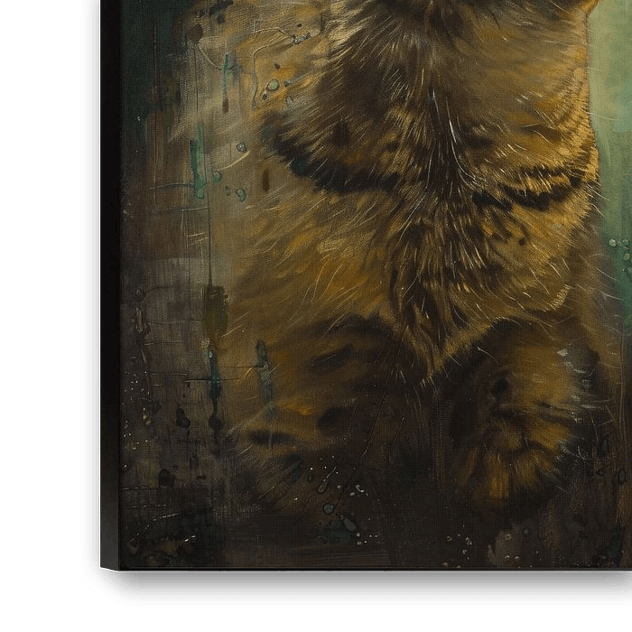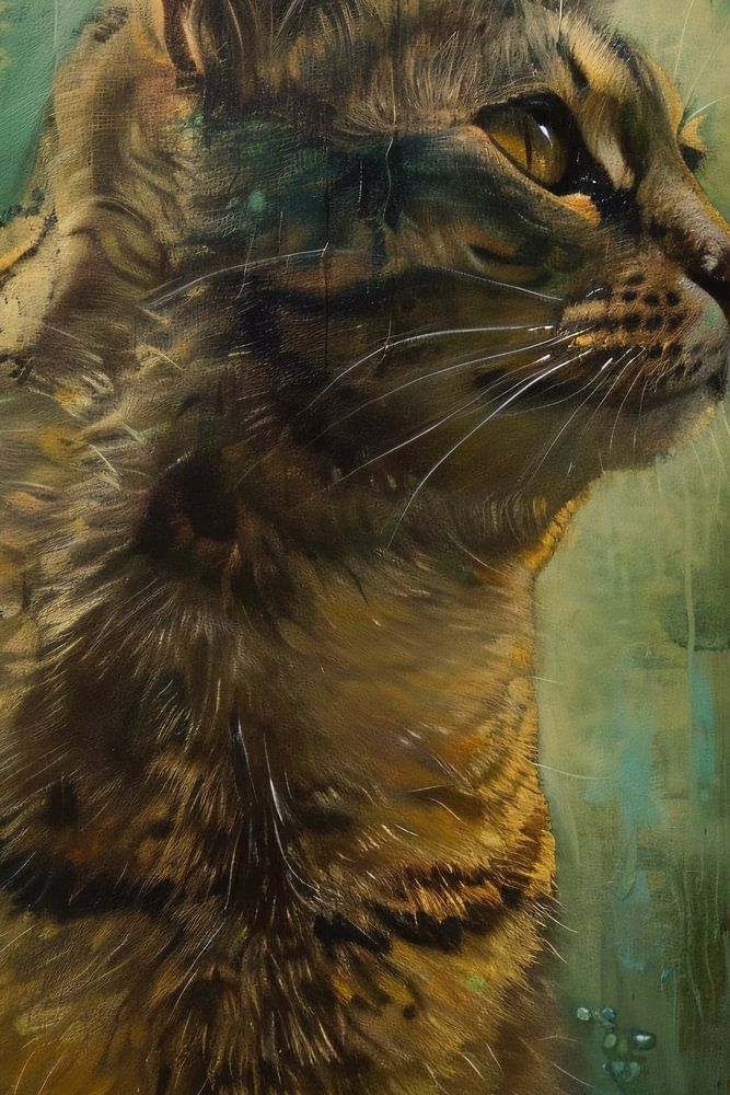 This beautiful painting depicts an elegant cat in a style reminiscent of Gustav Klimt's masterpieces. The rich textures and vibrant colours bring the cat to life, making this artwork a dynamic addition to any room. Perfect for animal and art lovers, this painting will undoubtedly be a talking point in your home. The subtle use of gold and intriguing background give the piece a modern look with a classic twist. Ideal for the bedroom or dining room, it adds a touch of sophistication and charm to your interior. A must-have for any art collector.