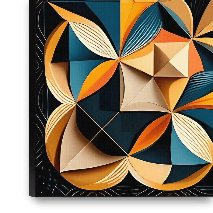 A visually stunning silhouette-style artwork that features a complex geometric pattern with sharp, precise lines. The composition mixes vibrant blues, golds and oranges to create a rich, elegant aesthetic. Each layer of the pattern features intricate details that reflect a high level of craftsmanship and sophistication. Embodying both…
