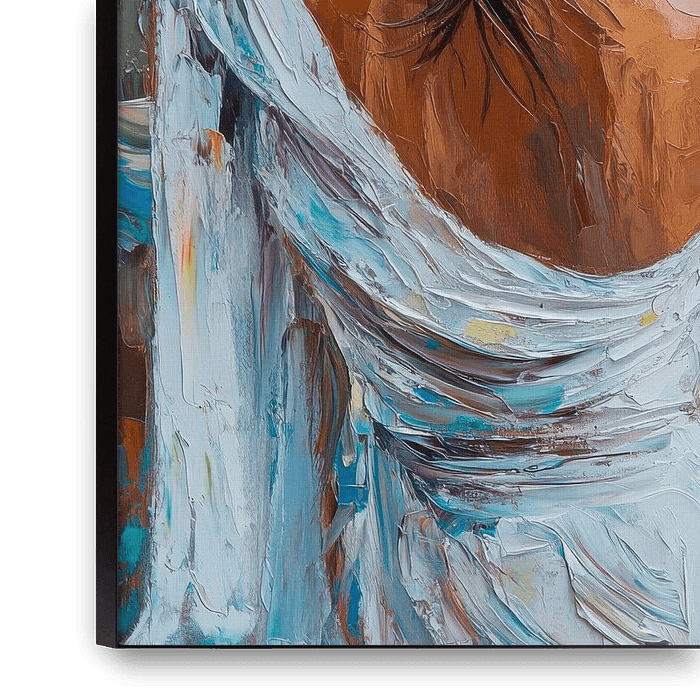 With an elegant gesture, she holds her hair back while the light glistens softly on her skin. The flowing, white drapery envelops her body and conveys a feeling of grace and freedom. Warm, harmonious colours in the background create an inviting atmosphere that reinforces the feeling of calm and self-confidence.