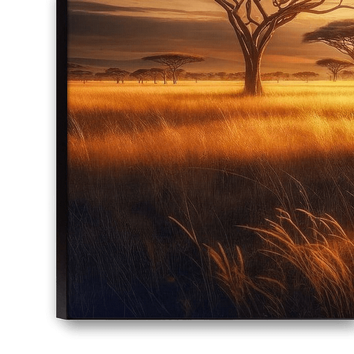 Contemporary art, realism, Africa, warmth, gold, harmony, well-being, expanse, freedom, serenity, golden hour, horizon, stability, presence, acacias
