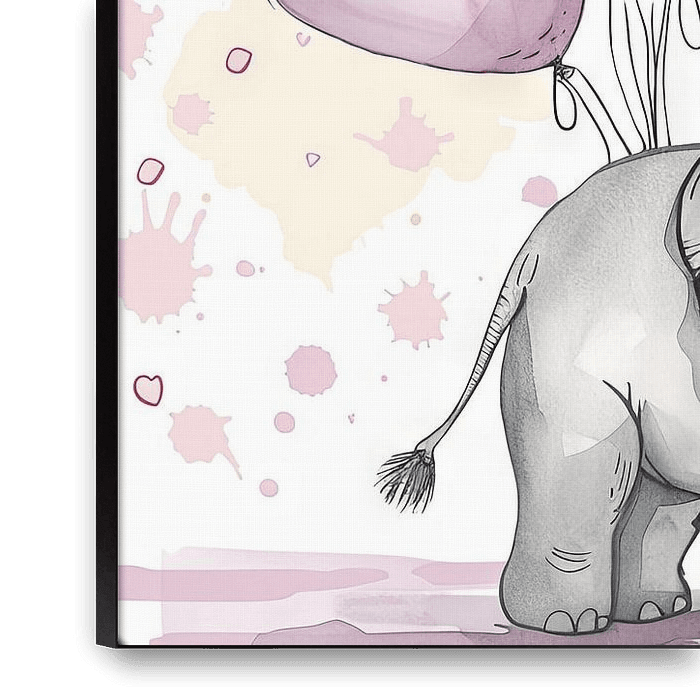 This enchanting watercolour painting shows a cheerful elephant playing with heart balloons in soft pink and pastel shades. Ideal for the nursery, it brings a cheerful atmosphere and a soft colour palette that will make children's hearts beat faster. The lovely details and soft watercolour technique give the picture a special warmth and…