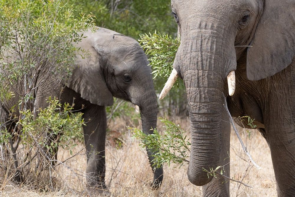 An Elephant together with her adolescent cub in South Africa. Enjoying some fresh twigs she has just picked herself.