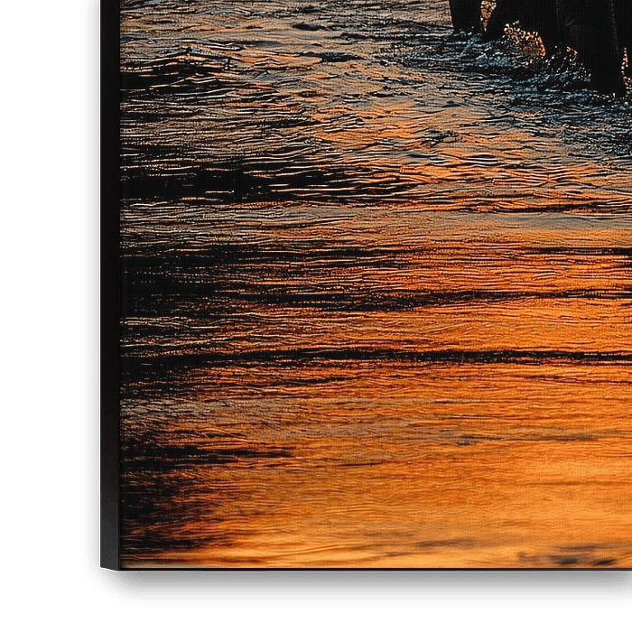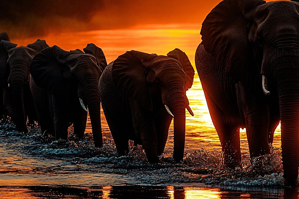 This beautiful design shows a herd of elephants passing through a river during a breathtaking sunset. The warm light of the sun colours the water in brilliant shades of orange and gold, while the silhouettes of the animals create a serene and majestic atmosphere. Ideal for nature lovers who want to enrich their interiors with a powerful and soothing image. This artwork exudes dynamism and calmness, perfect for giving a room a warm and unique feel.
