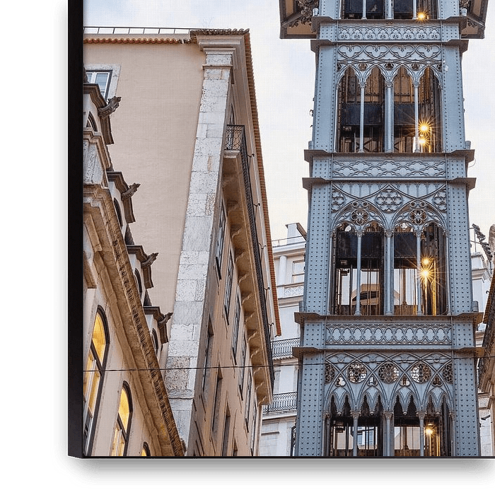 The Elevador de Santa Justa is one of Lisbon's best-known landmarks and impressively combines historical engineering with urban elegance. This architectural motif shows the iconic lift in a clear, symmetrical perspective that emphasises its filigree metal structures and vertical monumentality.