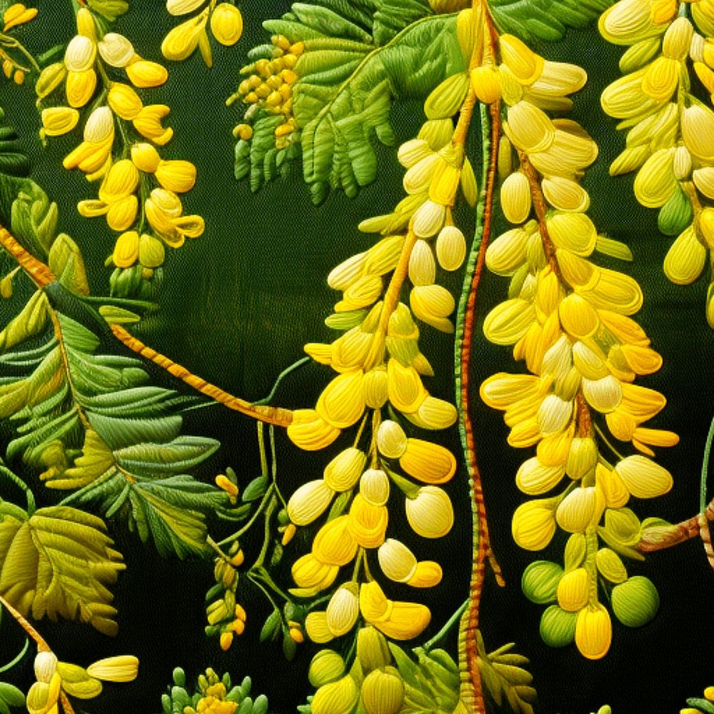This stunning artwork features a detailed depiction of golden laburnum flowers in the style of tapestry embroidery. The bright yellow strands of flowers hang heavily from the branches, creating a stark contrast to the deep, dark background. The leaves and branches are embroidered with an incredible texture that almost looks like three-dimensional shapes. Each stitch is carefully executed to capture the complexity and different shades of the plant, from the light greens of the young leaves to the darker, almost blue tones of the shadows. The entire image is a masterpiece of craftsmanship that captures the beauty of nature in an artful form.