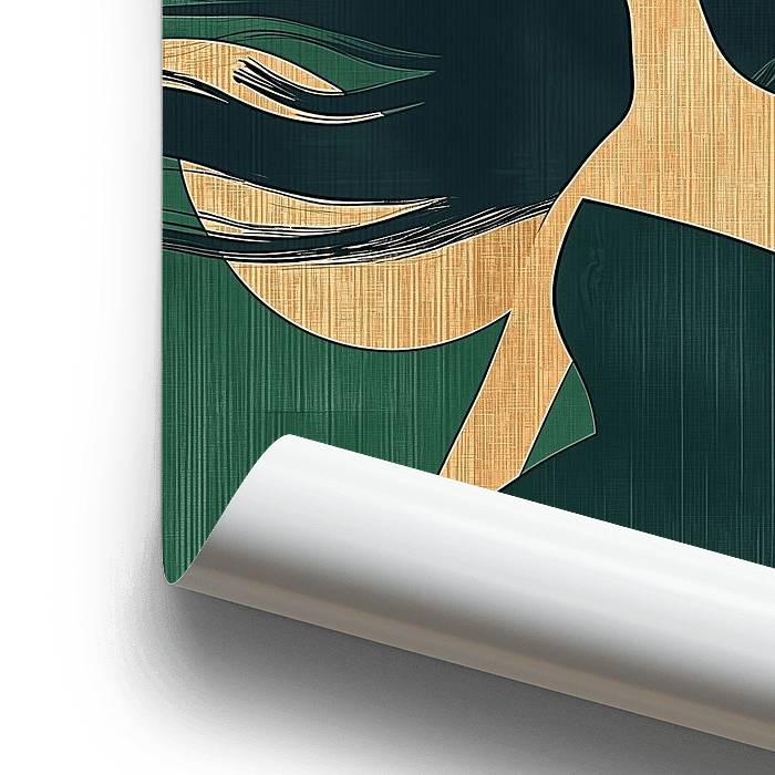This digital artwork fuses geometric abstraction with feminine elegance. A beige feminine silhouette contrasts with a deep green, rectangular background. Wavy black lines suggest moving hair. The tension between angular and organic forms invites reflection on nature versus urbanity and the feminine versus the architectural. The work…