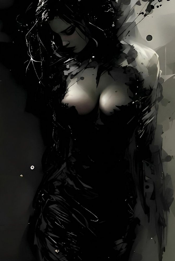 A powerful and mysterious artwork in which a female silhouette seems to emerge from abstract ink splashes and digital lines. The contrast between the deep black and light skin creates a dramatic effect that immediately captures the eye.