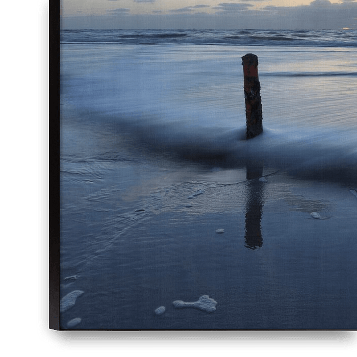 A pole in the sea is engulfed by rising water. By using a slightly slower shutter speed, there seems to be movement in the water.