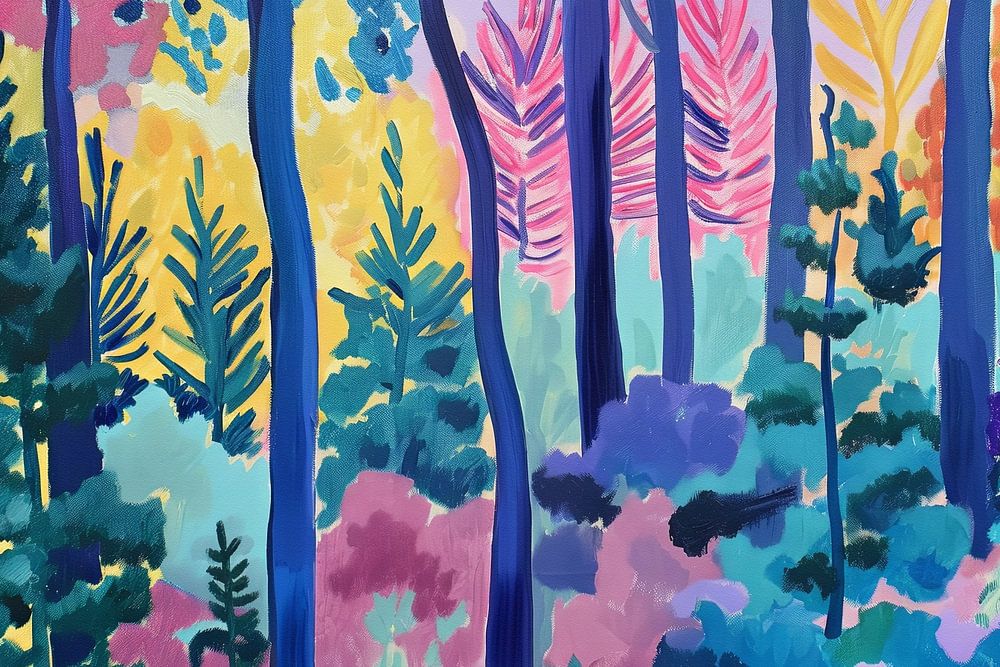 Walk through a forest where spring seems to last forever in 'Enchanted Forest'. The trees, with their cool blue and purple tones, stand out stately against a soft yellow sky, as if every day is a new morning full of possibilities. Watch the flowers in exuberant shades of orange and pink stretch out towards the light, each petal a silent invitation to pause and breathe in the beauty. This work, vibrant with life and colour, is inspired by the fresh, hopeful energy of spring. It brings an air of renewal and cheerfulness, perfect for anyone looking to bring a touch of natural splendour into their home. It is as if, with this painting, you always have a piece of the most beautiful days of the year on your wall.
