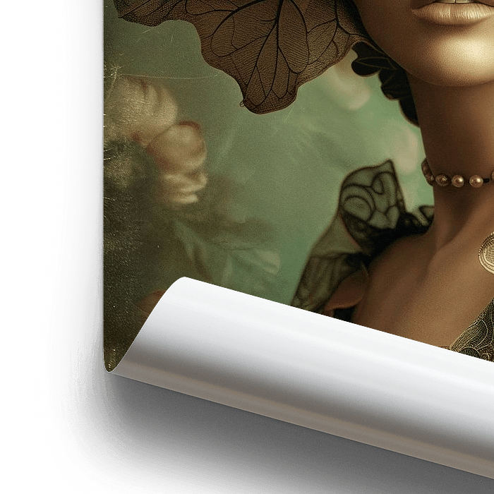 Intriguing portrait of a woman with a unique and imaginative look. She wears striking sunglasses with large, dark lenses that evoke an air of mystery. Her head is adorned with large flowers in soft shades of pink and beige, giving her an almost fairy-like appearance. The flowers seem to grow out of her head, making her one with…