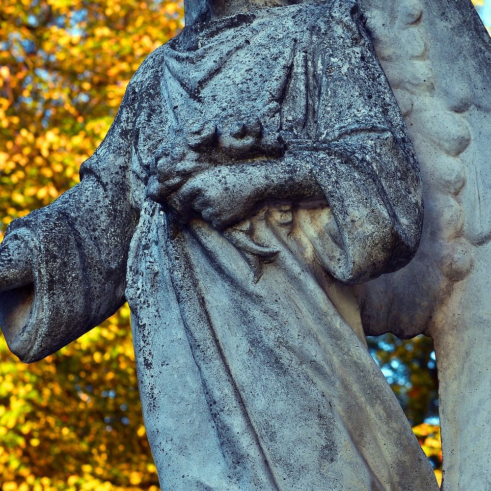 I discovered this enchanting, poetic angel figure during my autumn photo walk in the East Berlin district of Pankow. The bright colouring of the leaves in shades of red, orange and yellow lends the natural motif a warm and harmonious atmosphere. The graceful, slightly lowered face of the angel sculpture radiates calm and serenity.
