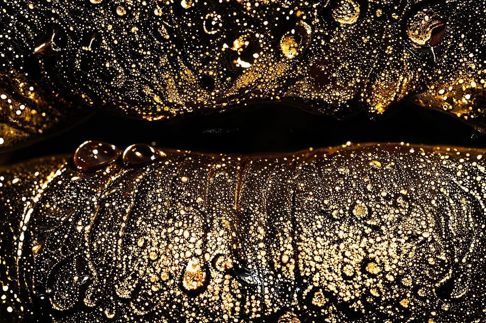 This striking image shows a close-up of lips covered in sparkling golden glitter, combined with small, clear water droplets that catch the light. The result is a fascinating play of shimmer and shadow, giving this image a luxurious and almost magical feel. This artwork can transform any space, from a modern living room to a chic bedroom, by adding a tone of elegance and mystery. Ideal for those who want to add a unique and artistic touch to their interiors.