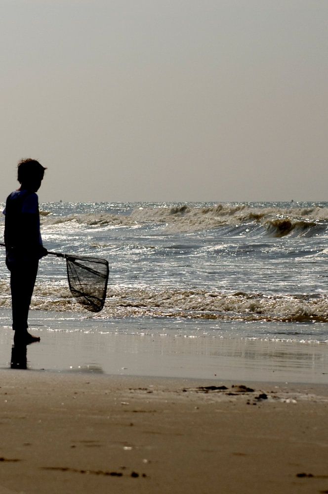 Suddenly, I see a boy standing in the surf. With a t-shirt and trousers rolled up to just above the ankles, he is ready for the evening. He has eyes only for the waves and the damp beach. He looks ahead, motionless. And I dream with him about what he might catch in his net. A squid, a small shark or... And the real summer has yet to begin.