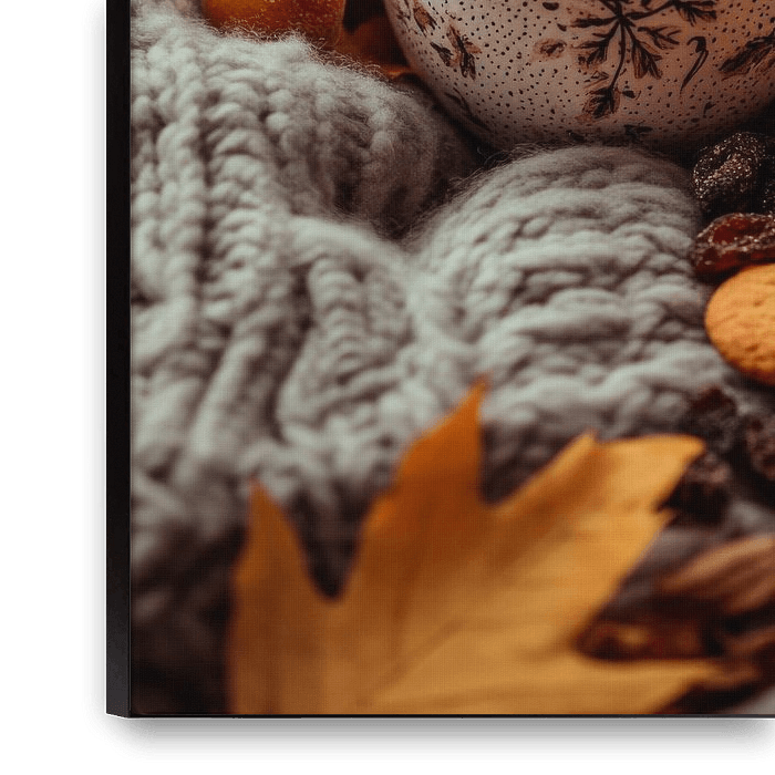A warm scene unfolds in the middle of the cosy knitted blanket: a steaming cup of tea surrounded by autumnal leaves, while delicious biscuits lie temptingly right next to it. A harmonious blend of warm colours and rustic charm that perfectly embodies the cosiness of autumn days. Inviting and calming, this sight promises sweet moments of…